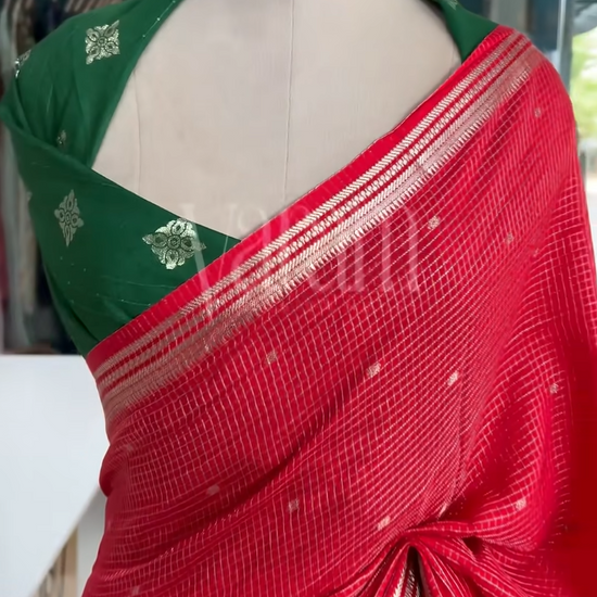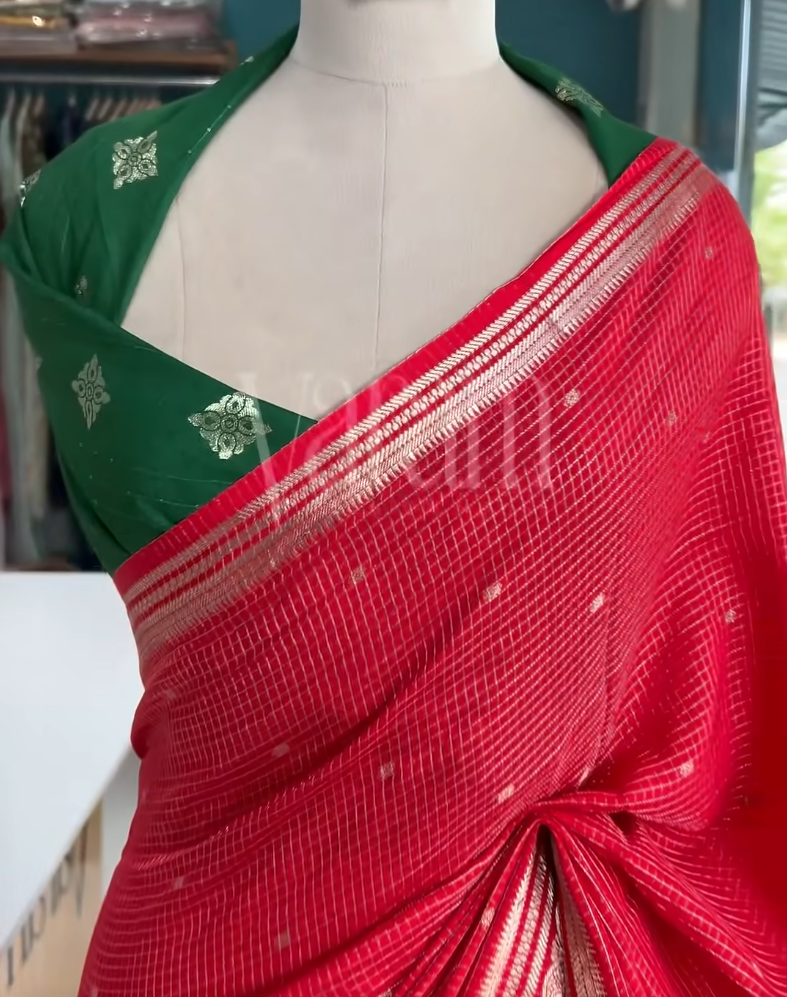 Timeless Assam silk with classic checks and zari grace. Soft and falling.