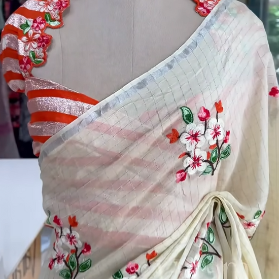 Lightweight and graceful, this pastel georgette saree features a delicate checkered pattern with vibrant floral thread embroidery scattered across the body. The soft drape is complemented by a subtle silver zari border, and the contrast floral blouse neckline adds a touch of festive charm. A perfect pick for casual celebrations, day events, or elegant gatherings.