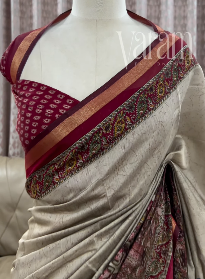 Drape yourself in timeless elegance with this exquisite Muga silk saree, featuring intricate digital prints inspired by royal heritage paintings. The earthy beige base is beautifully enhanced with a maroon contrast blouse and detailed borders, bringing a touch of tradition with a contemporary twist. Perfect for festive gatherings, weddings, and cultural celebrations, this saree is a masterpiece of grace and sophistication.